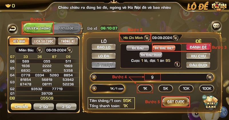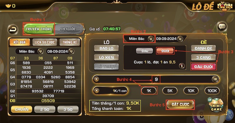 VD: Đánh 1K cho số 7, tổng thanh toán: 1K, Nếu giải ĐB là xxx7x thì tiền thắng: 1K x 9,5 = 9,5K