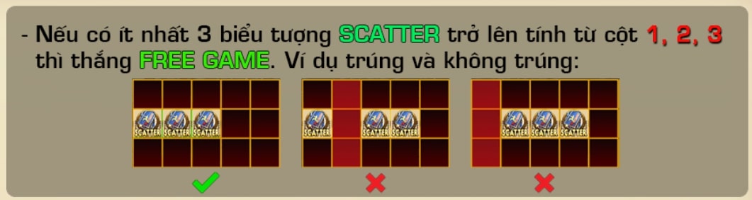Kết quả có 3 biểu tượng Scatter trở lên tính từ cột đầu tiên sẽ nhận được vòng quay miễn phí Free Game. Ví dụ trúng và không trúng: