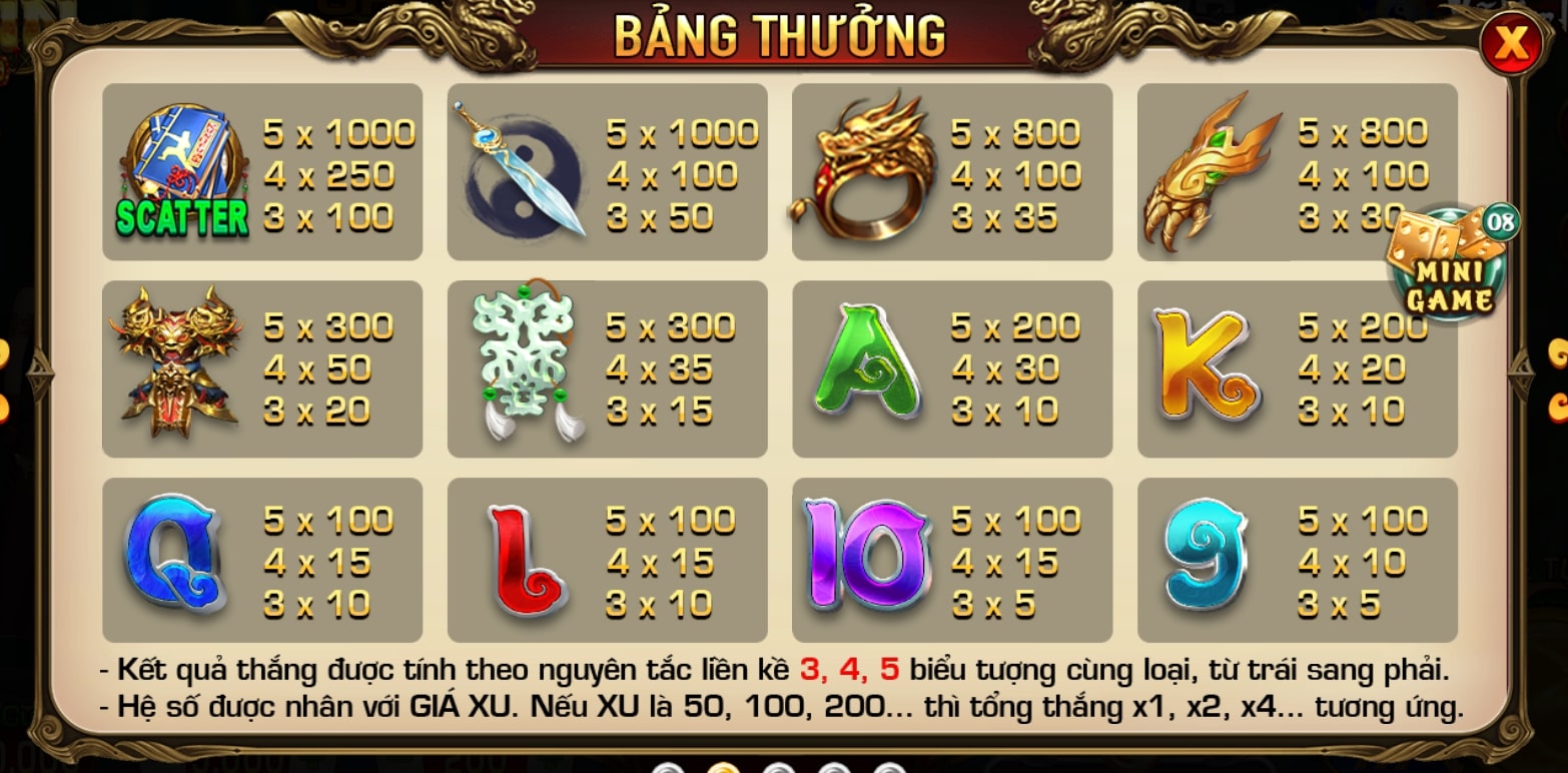 Hệ số được nhân với GIÁ XU. nếu XU là 50,100,200… thì tổng thắng x1, x2, x4… tương ứng