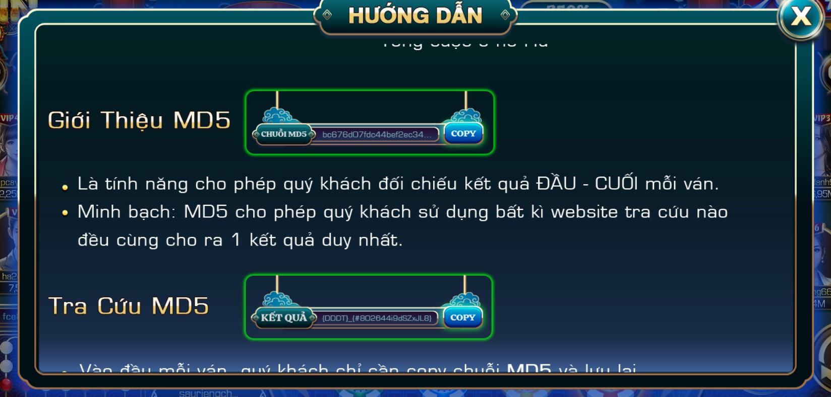 • Vào đầu mỗi ván quý khách chỉ cần copy chuỗi MD5 và lưu lại.
