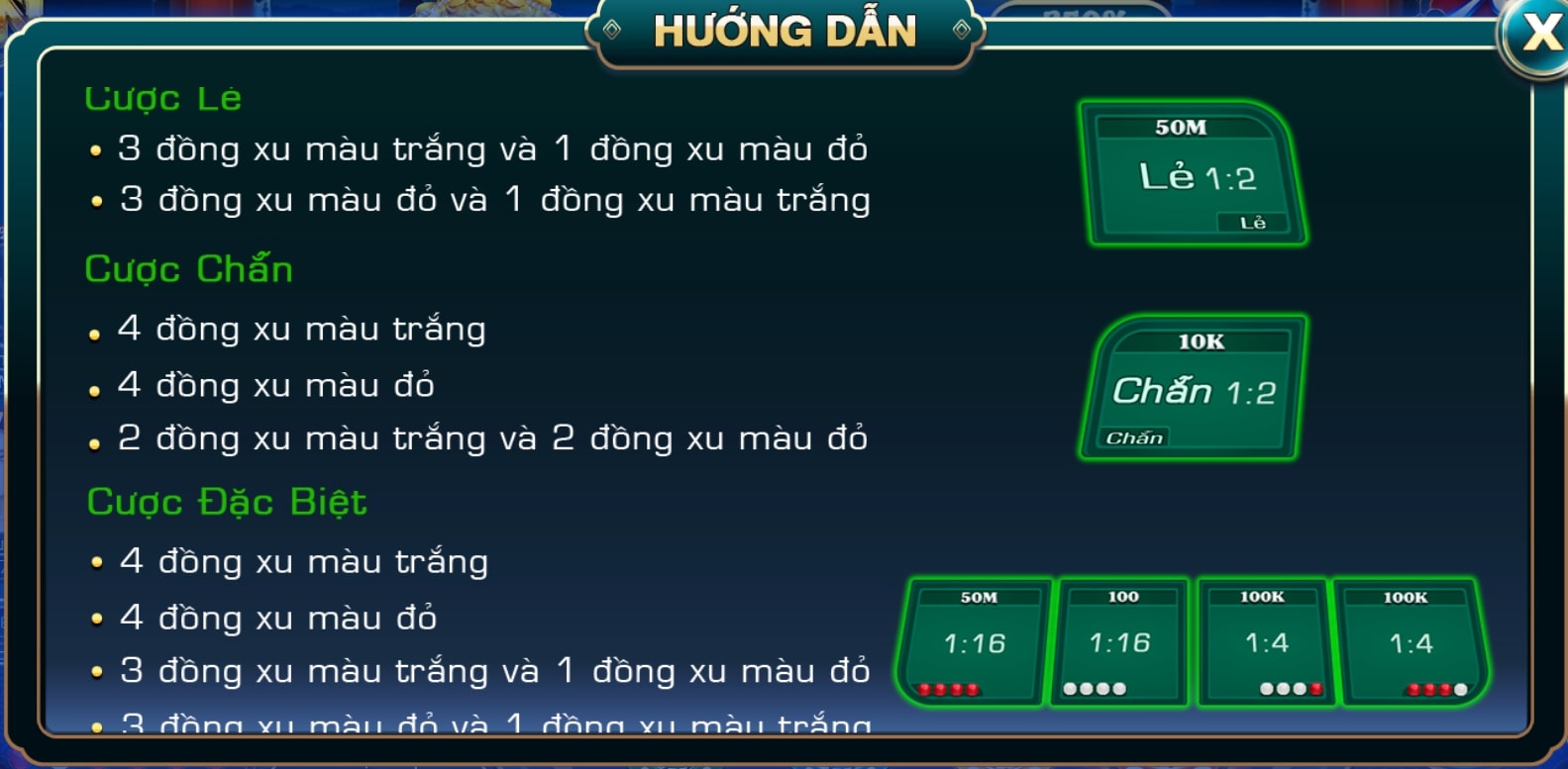 • Kết quả 3 viên xí ngầu là 222 hoặc 444, và kết quả phiên là Chẵn: các cửa thắng sẽ được thưởng Siêu Bão.